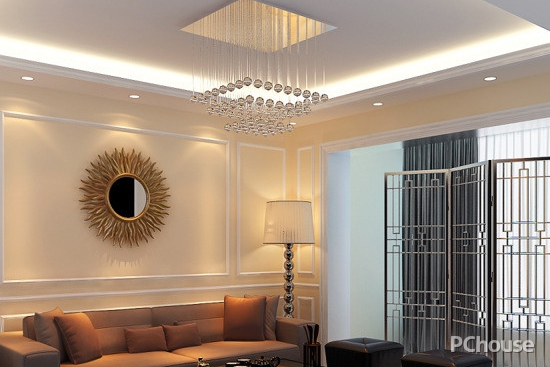 2、四周吊頂,中間不吊:此種吊頂可用木材夾板成型,設(shè)計(jì)成各種形狀,再配以射燈和筒燈,在不吊頂?shù)闹虚g部分配上較新穎的吸頂燈,會(huì)使人覺得房間空間增高了,尤其是面積較大的客廳,效果會(huì)更好。