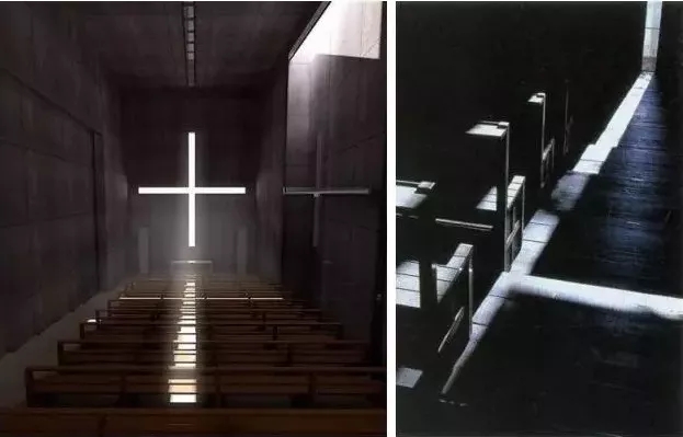 舉個例子,光之教堂:是日本著名的建筑之一,在教堂的一面墻上開了一個十字形的洞而營造的特殊光影效果,使信徒們產生接近上帝的錯覺。