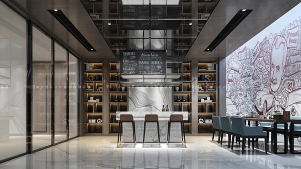 整體的白色給人以恬靜閑適之感,大面積落地窗明亮通透,灰色背景墻與墨綠色點綴延續整體主題色彩,涂鴉墻則作為空間延伸將視線轉移到競技室,相得益彰。