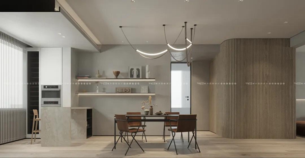 餐廳居于整個空間的中心位置,白色餐凳皎潔如月,吊頂設計如云層般疊巒,吧臺設計以純白大理石與現代風座椅打造簡約利落之感。