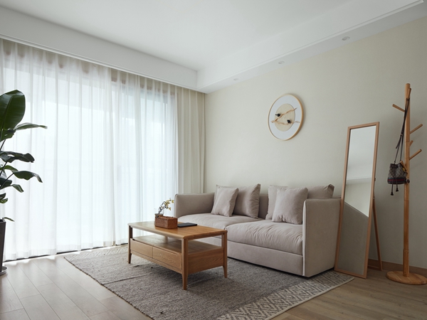 在這套日式風格室內設計案例中,錦華無錫裝飾公司采用了非常簡潔的吊頂設計,沒有多余繁復的造型,打造簡約感。地板選用淺原木色,與家具的顏色相得益彰,呼應襯托。客廳軟裝設計上,沒有過多的背景墻裝飾、落地裝飾,一副自然裝飾畫、一面落地鏡、一個掛衣架,簡單實用足矣。