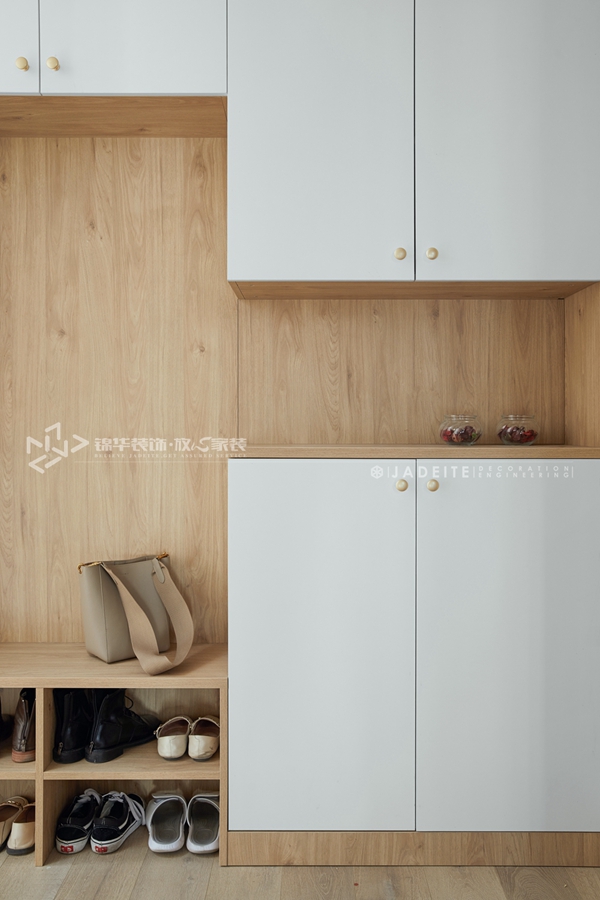 錦華無錫裝飾公司的這套日式風格室內設計案例,在入戶鞋柜的打造上,采用了天然原木材質做基底,搭配白色的柜門,簡單的圓把手做點綴,顏色搭配上落落大方,干凈清爽。在功能設計上,既設置了隱藏鞋柜用來放不常穿的鞋,又設置明格,用來放置平時常穿的鞋,簡易實用。