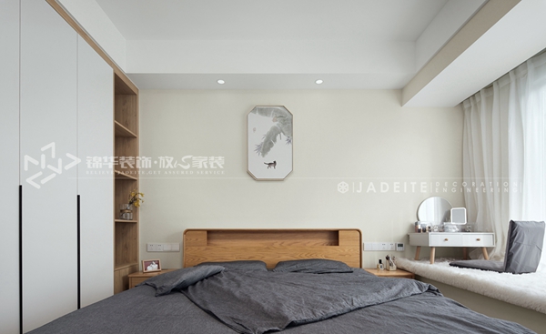 這套日式風格室內設計案例的臥室設計,因為小戶型的局限性,錦華無錫裝飾公司將飄窗部分進行了功能利用,打造成女主人的化妝區,平時在這里看看書、刷刷劇也是不錯的選擇。整個空間的色彩,也是原木色加白色的搭配方式,整體看上去非常清爽、令人心情愉悅。