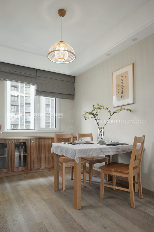 錦華無錫裝飾公司在這套日式風格室內設計案例餐廳的設計上,也是突出了簡約和實用的特點。方形小餐桌椅靠墻擺放,節省空間,滿足小戶型生活需求。布藝卷簾、竹藝吊燈、米色裝飾字畫,都為這個空間增加了另一些溫馨氛圍感。