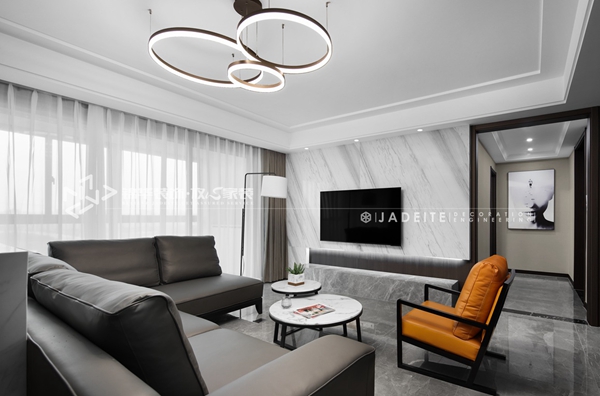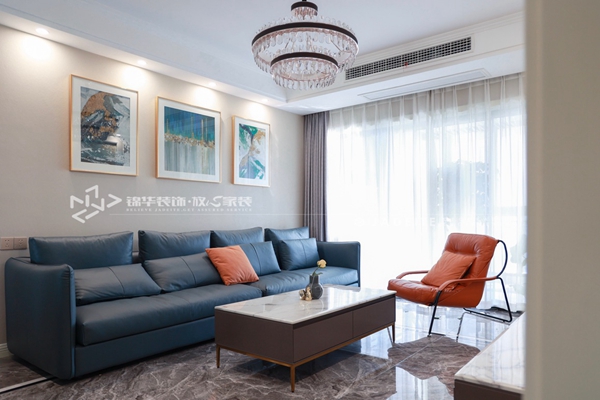 這套無(wú)錫家裝案例的家具搭配與之前的不太相同,大膽使用湖藍(lán)色皮質(zhì)四人沙發(fā),藍(lán)色與橙色的撞色搭配,也讓整個(gè)空間更具有時(shí)尚感,看上去更有特色。