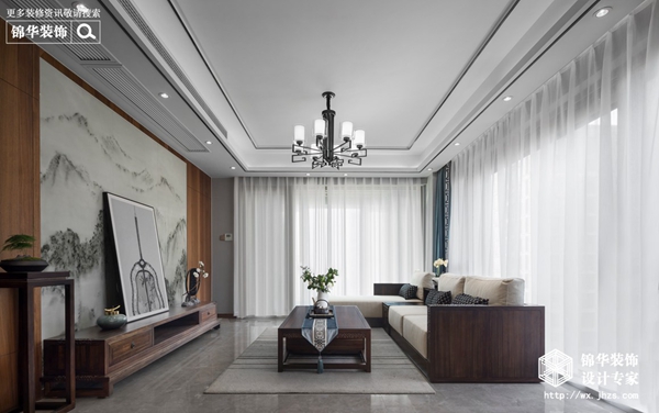 這一套中式風格中,值得無錫裝修業主關注到的是整體帶來的氣韻感,仿佛行云流水般的流暢。背景墻的黑色裝飾線條、黑胡桃色吊燈與黑胡桃木色家具交相呼應,暖色燈光和米白色沙發軟包又中和了黑色帶來的沉悶感。如高山流水般的裝飾畫背景為整個空間增加了一些柔和感,富有意境。