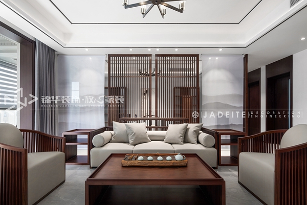 在這一套中式風格案例中,無錫裝修團隊采用的是棕胡桃木色家具搭配,整體設計也尊崇了中式風格的對稱講究,左右兩邊對稱的單人沙發椅,方形胡桃木色茶幾,左右對稱的三人沙發加上左右兩邊各一個邊幾,再搭配兩片同色系木質屏風,不僅是將視野延伸,也是將中式對稱美做到極致。
