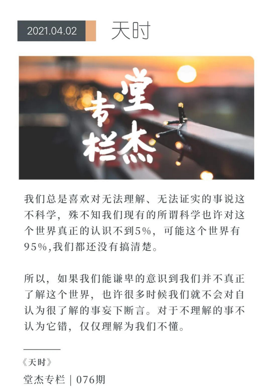 我們總是喜歡對無法理解、無法證實的事說這不科學,殊不知我們現有的所謂科學也許對這個世界真正的認識不到5%,可能這個世界有95%我們都還沒有搞清楚。
