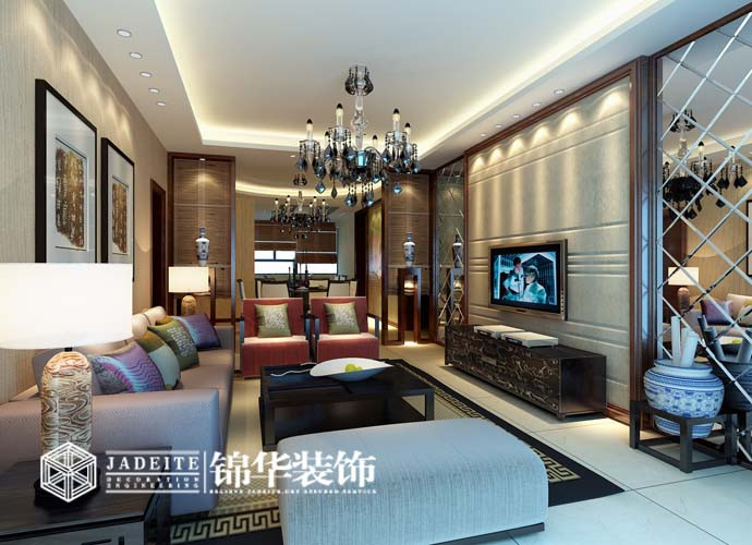 客廳以暖色為主色調,給人一種溫馨舒適的感覺。地面采用地磚,簡潔而大方,在加一簡約的家具,布藝沙發為主。吊頂為一級直線吊頂。這種吊頂的好處是增大空間感,內置多個射燈滿足不同光線的需要。中間設計一個水晶的實用大吊燈,給人一種高貴溫馨的感覺。