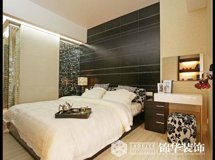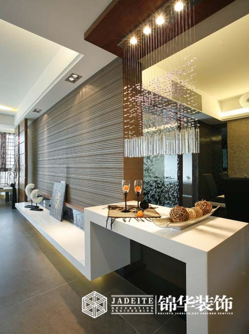 本案為現代簡約風格。家是心靈的港灣,讓居住者感受到簡約的魅力。簡約但并不簡單的裝飾風格。當疲憊的身心對家的依戀越發強烈,人們想要的是輕松、自由的環境,本案以溫馨為基調,美學上推崇唯美的色彩,在居室的空間的處理上,力求表現自然輕松的情趣,設計上講求色彩關系,注重大小色塊間的組合。在室內,窗簾、桌巾、沙發套、燈罩等均以低彩度色調和棉織品為主??蛷d的窗簾特別采用了半透明織物,保證了客廳的通透性,透過窗簾可隱約看到窗外的觀景露臺。沙發上素雅的小細花條紋格子圖案也是常用的元素,采用低彩度、線條簡單的家具與簡單的裝飾品相得益彰。本套戶型比較方正,布局合理,采光通風良好。對于生活節奏比較快的業主,沒有過多的考慮日常生活繁瑣的細節,整體空間中門廳,客廳,餐廳在視線上比較集中,客廳朝向較正,保證了空間的開闊性和通透性,所以就沒有必要再刻意的劃分功能區域。為了和客廳呼應,主臥室里的枕頭、休閑凳也采用了小細花圖案的套子,給人以低調、高雅、神秘的感覺。