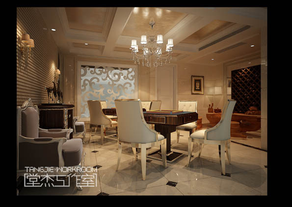 本案的地下室特別的定義為家庭娛樂(lè)室,規(guī)劃了包括棋牌區(qū)、酒吧區(qū)、娛樂(lè)室、健身區(qū)等功能區(qū)域.不同于其它地下室,這里的設(shè)計(jì)延續(xù)了居住空間的基調(diào),精致敞亮,擁有著讓人愉悅的情緒和歡快的氛圍。而仔細(xì)品味每一個(gè)細(xì)節(jié)都是主人品質(zhì)生活的體現(xiàn),融于空間也來(lái)自于空間。