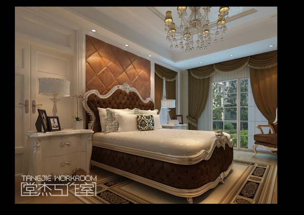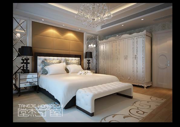 主臥作為業(yè)主的私密空間,主要以功能性和舒適為考慮的重點(diǎn),此案運(yùn)用了大量的藝術(shù)花紋墻紙滿鋪,床頭背景運(yùn)用實(shí)木線條,壁燈,鏡面等裝飾元素,豐富了空間,整個(gè)主臥大氣,舒適,奢華。。。。